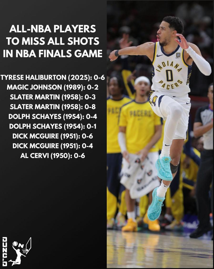 据统计,哈利伯顿是1958年之后,首位在总决赛中无得分进账的最佳阵容球员(1989年的魔术师约翰逊仅出战5分钟伤退)。