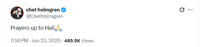 此役,哈利伯顿首节伤退,随后没有回归比赛。赛后,作为对手的切特更新社媒向哈利伯顿发表祝福,他写道:“向哈利伯顿致敬祈祷。”
