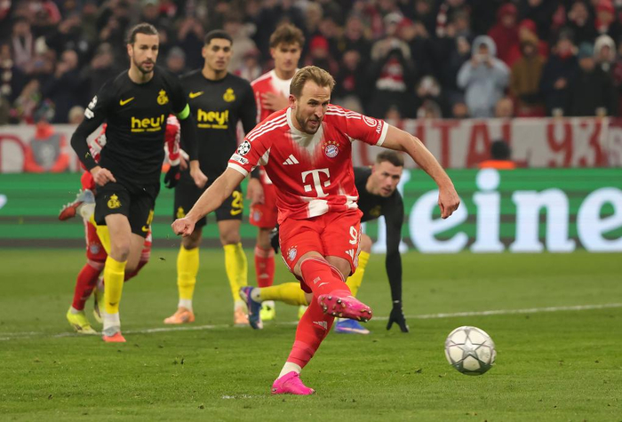 1月21日,拜仁慕尼黑队球员凯恩(前)主罚点球破门。新华社发(菲利普·鲁伊兹摄)