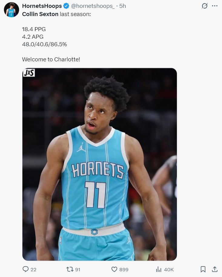 塞克斯顿上赛季场均18.4分4.2助攻,命中率48%,三分命中率40.6%,他来到黄蜂后会搭档拉梅洛一同先发。