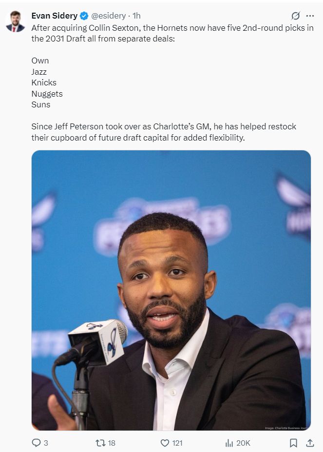 《福布斯体育》记者埃文-斯迪瑞写道:杰夫-彼得森已经为黄蜂队囤积了多个2031年的次轮签:黄蜂、爵士、尼克斯、掘金、太阳,自从彼得森接手黄蜂GM一职后他已经帮助球队获得多个未来选秀权。