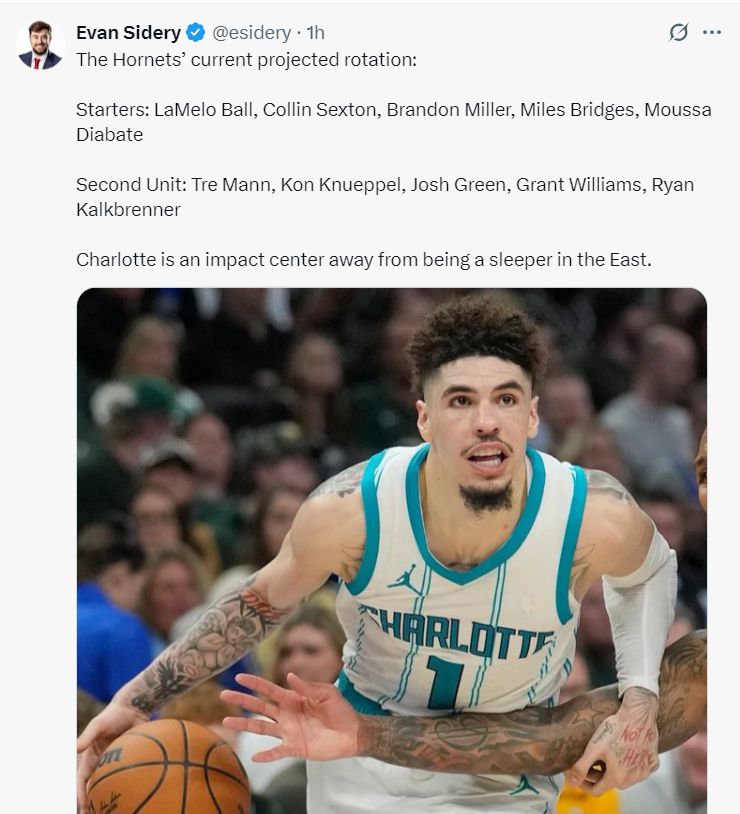 埃文-斯迪瑞还表示黄蜂新赛季的10人轮换应该已经确定——先发:拉梅洛、塞克斯顿、布里奇斯、米勒、迪亚巴特;