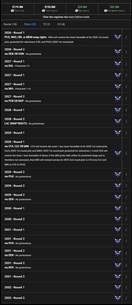 2026年-2032年这七年之间黄蜂队还有10个首轮签与12个次轮签,换言之这支球队很有可能在未来五年内崛起。