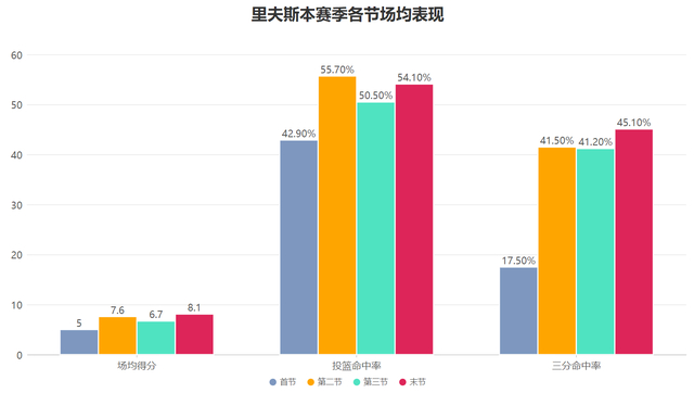 本赛季里夫斯的个人数据暴涨只是一方面,他更加值得信赖的是末节能力以及面对高强度防守时的硬解能力,本赛季的他末节场均贡献8.1分为四节中的最高,并且末节两项命中率飙升到54.1%与45.1%,而这样的表现放眼联盟也是顶尖水准: