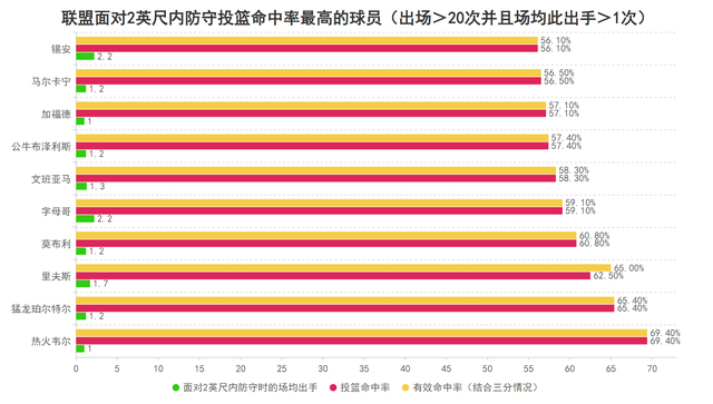 不仅如此,在联盟面对2英尺内防守场均出手1次以上的球员里,里夫斯的投篮与有效命中率位于联盟的第二高仅次于两名中锋热火的韦尔与猛龙的珀尔特尔,在命中率最高球员几乎都是内线或扣将的情况下,里夫斯显得格格不入也表明了他在面对超高强度防守时的终结水准有多么夸张。